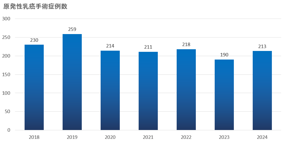 2024年の手術件数は、原発性乳癌手術は213件、良性疾患などその他の手術が17件でした。またHBOC対側予防切除は5件施行しております。形成外科と合同での同時再建手術は28件施行しております。