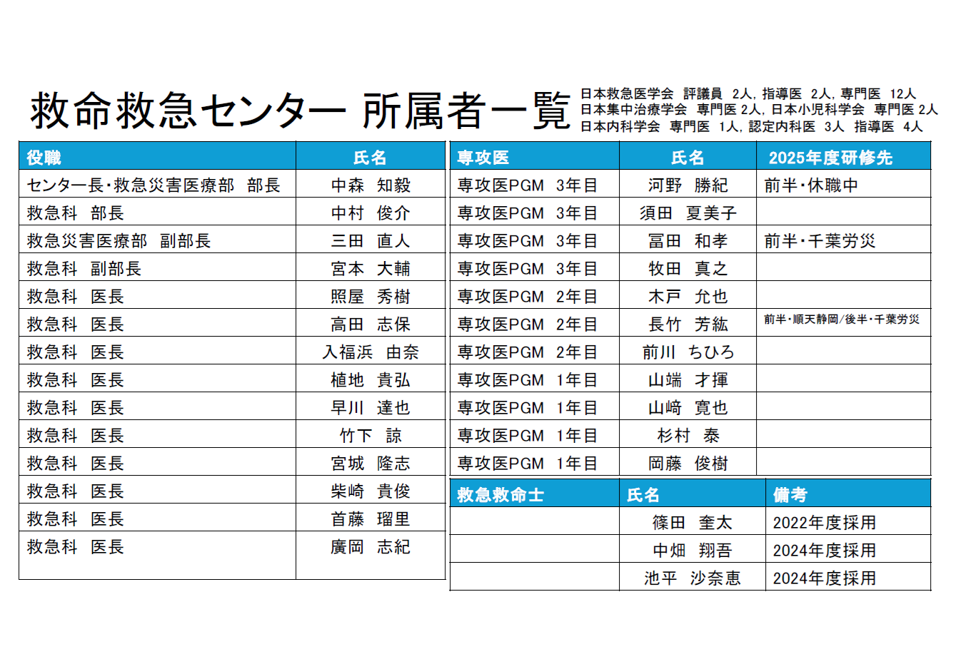 現在、11名の救急科専攻医が研修中で、救急科専門医も12名(うち、救急科指導医2名、集中治療専門医2名、小児科専門医3名)とスタッフ数も充実しています。教育体制の整備も進んでおり、充実した研修を送ることができるための体制が揃っています。ぜひ一度、見学にお越しください。