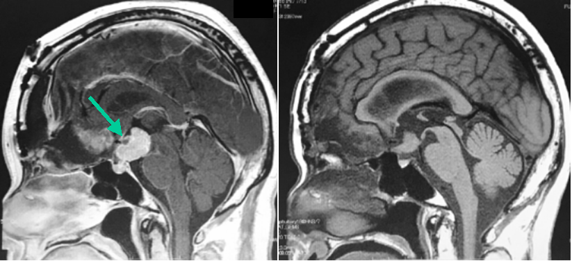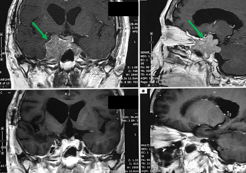 60代女性で,視力低下で発症し,他院での開頭腫瘍摘出術後の残存腫瘍(左写真緑矢印)に対する照目的に当科を紹介受診した患者さんです。Novalis STxによる定位的多分割照射54Gy/30回を行いました。右写真は照射から4年後のMRI画像ですが,腫瘍の明らかな縮小がみられます。照射前は両側視力低下(0.3, 0.4)と両耳側半盲がみられましたが,4年後は両側視力(0.8, 0.8)で両耳側半盲も改善しました。