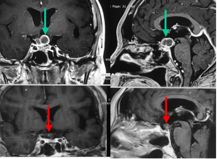 60代女性で,視力低下で発症した下垂体腺腫(現在ではPitNETといいます)。他院での2回の摘出術後の残存腫瘍(上段緑矢印)に対する放射線治療目的に当科を紹介受診した患者さんです。Novalis STxによる定位的多分割照射54Gy/30回を行いました。下段は照射から7年後のMRI画像ですが,腫瘍の明らかな縮小がみられます。照射に伴う視機能障害は生じていません。