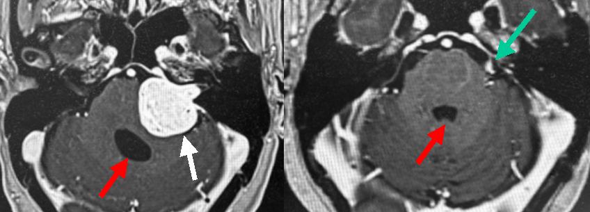20代女性の比較的小さな聴神経腫瘍です(左MRI写真の赤い矢印先端の細長い白いかたまり)。小さな腫瘍ですが、若いということもあり手術により全摘出しました(右MRI写真)。聴力は温存され、顔面神経機能も正常のままでした。