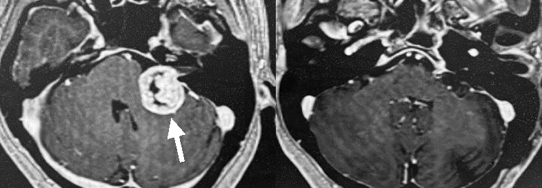 右の聴神経腫瘍です。すでに他院にてガンマナイフ治療が2回行われていましたが、腫瘍の増大を抑えきれず当科を紹介受診しました(左写真の赤矢印)。開頭手術により腫瘍をほぼ全摘出しました(右写真)。手術前から軽度の顔面麻痺がみられましたが、術後その悪化はみられませんでした。当科では、このようなガンマナイフ治療後の聴神経腫瘍手術も多く行っています。