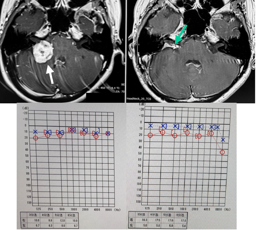 30代女性の右聴神経腫瘍です(上段左写真白矢印)。腫瘍が大きいために開頭腫瘍摘出を行いました。この患者さんは腫瘍側の聴力が保たれていました(下段左の聴力検査結果参照。赤が腫瘍側である右の聴力です)。年齢も若いことから腫瘍摘出と共に聴力の温存も図る方針としました。腫瘍と蝸牛神経,顔面神経の癒着が比較的強かったため,神経上に薄く一層の腫瘍を残存させました. 術中,0.03mAの電気刺激に対する良好な反応を維持することができ,術後に顔面神経麻痺は生じませんでした。術後のMRIでは神経上に残したわずかな腫瘍が確認できます(上段右写真緑矢印)。術後の聴力検査では,高音域でわすかな低下がみられますが,ほぼ術前と同程度に聴力は保たれています(下段右の聴力検査結果参照.赤が腫瘍側である右の聴力です)。 残存腫瘍に対しては半年ごとのMRIによる追跡を行い,増大傾向がみられれば,ガンマナイフを検討する方針としています。