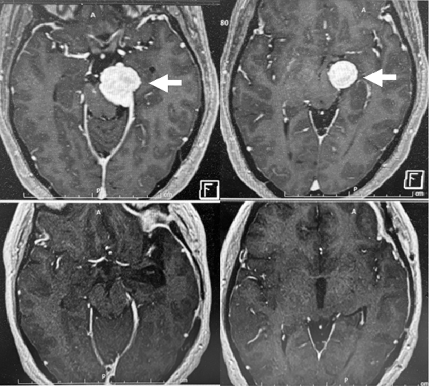 60代女性の聴神経腫瘍です(上段左写真赤矢印)。腫瘍が大きかったため開頭手術を行い、全摘出しました。術前から腫瘍側の聴力は喪失であったため温存は図りませんでした。上段右写真は術後のMRIですが、腫瘍がすべて摘出されていることがわかります。
